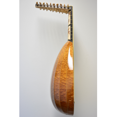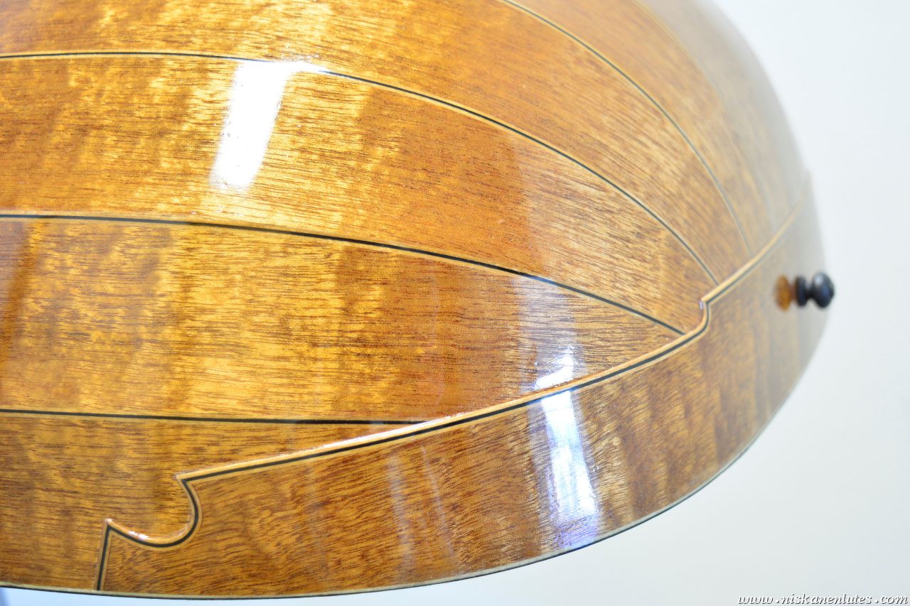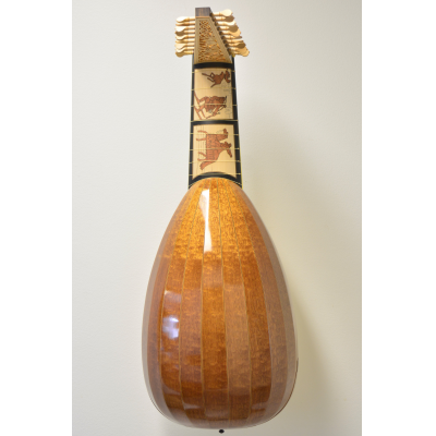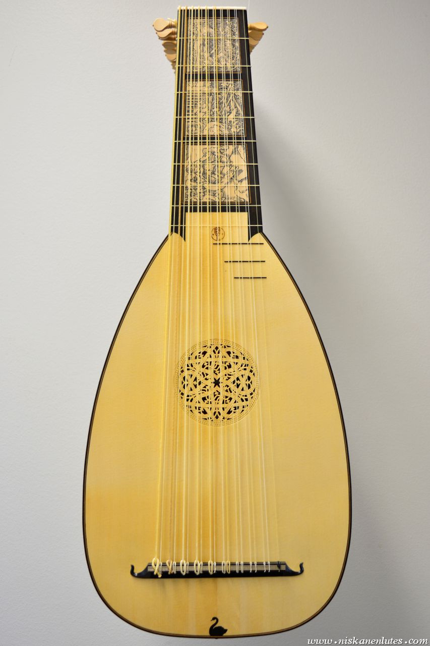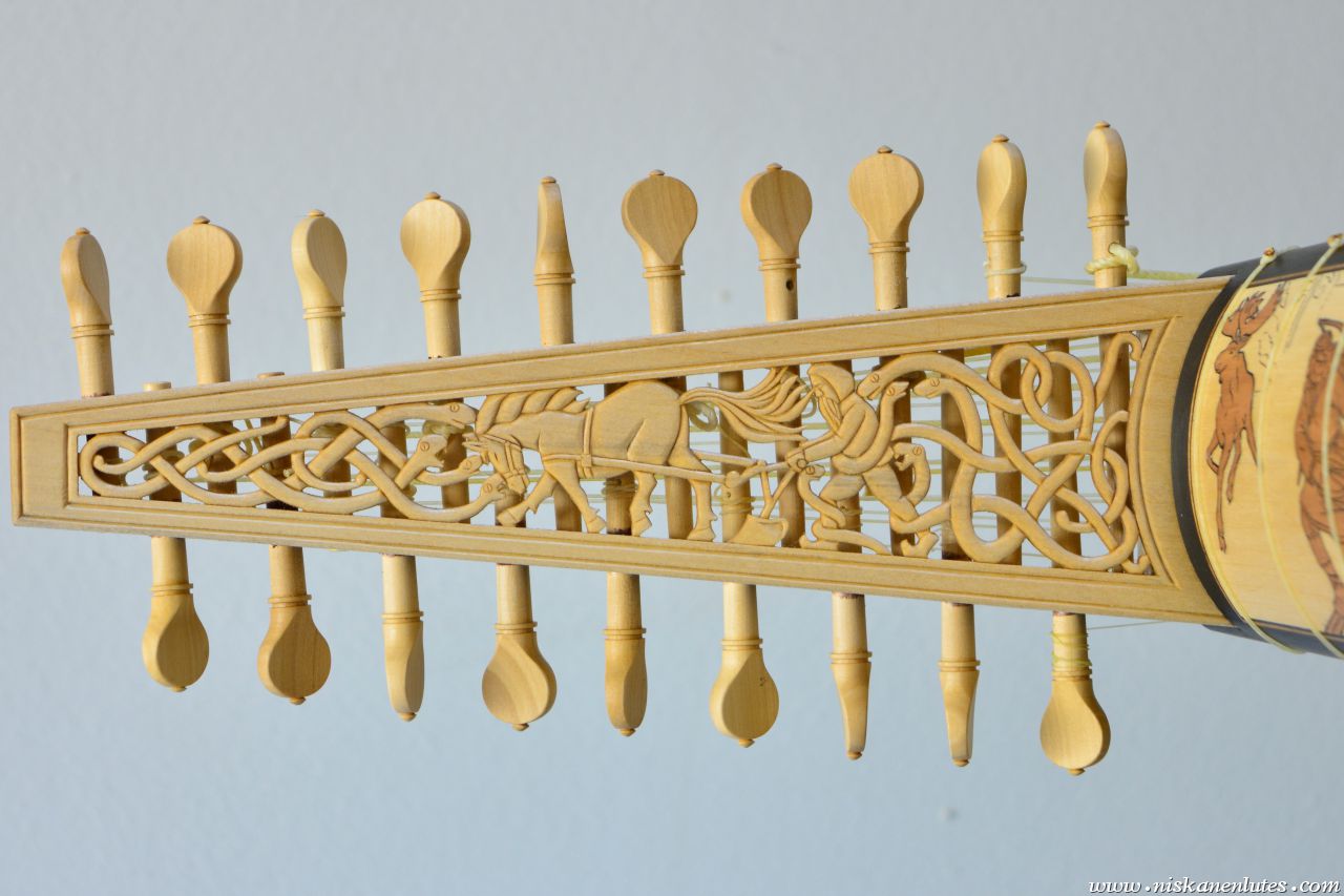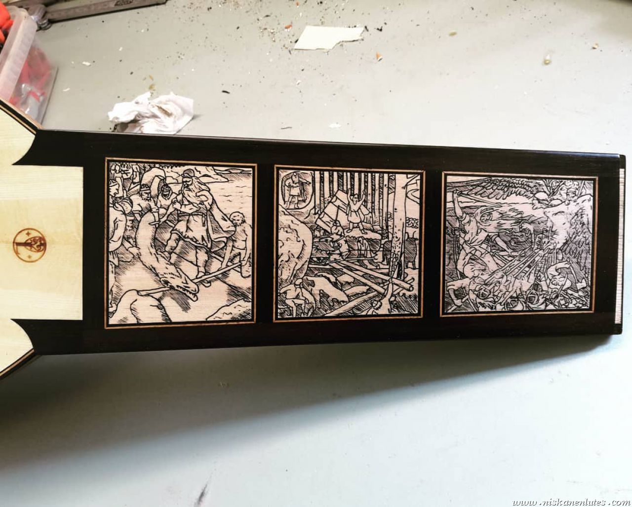 The neck panels are based on 20th century Finnish artists' depictions of the Kalevala epic. The rosette and pegbox designs are my own art. The body is made of figured sapele with cherry-ebony filets. 10 courses, based on the Hans Frei lute.