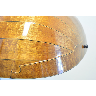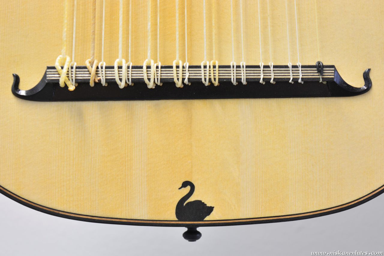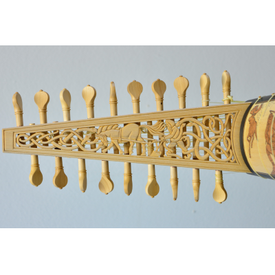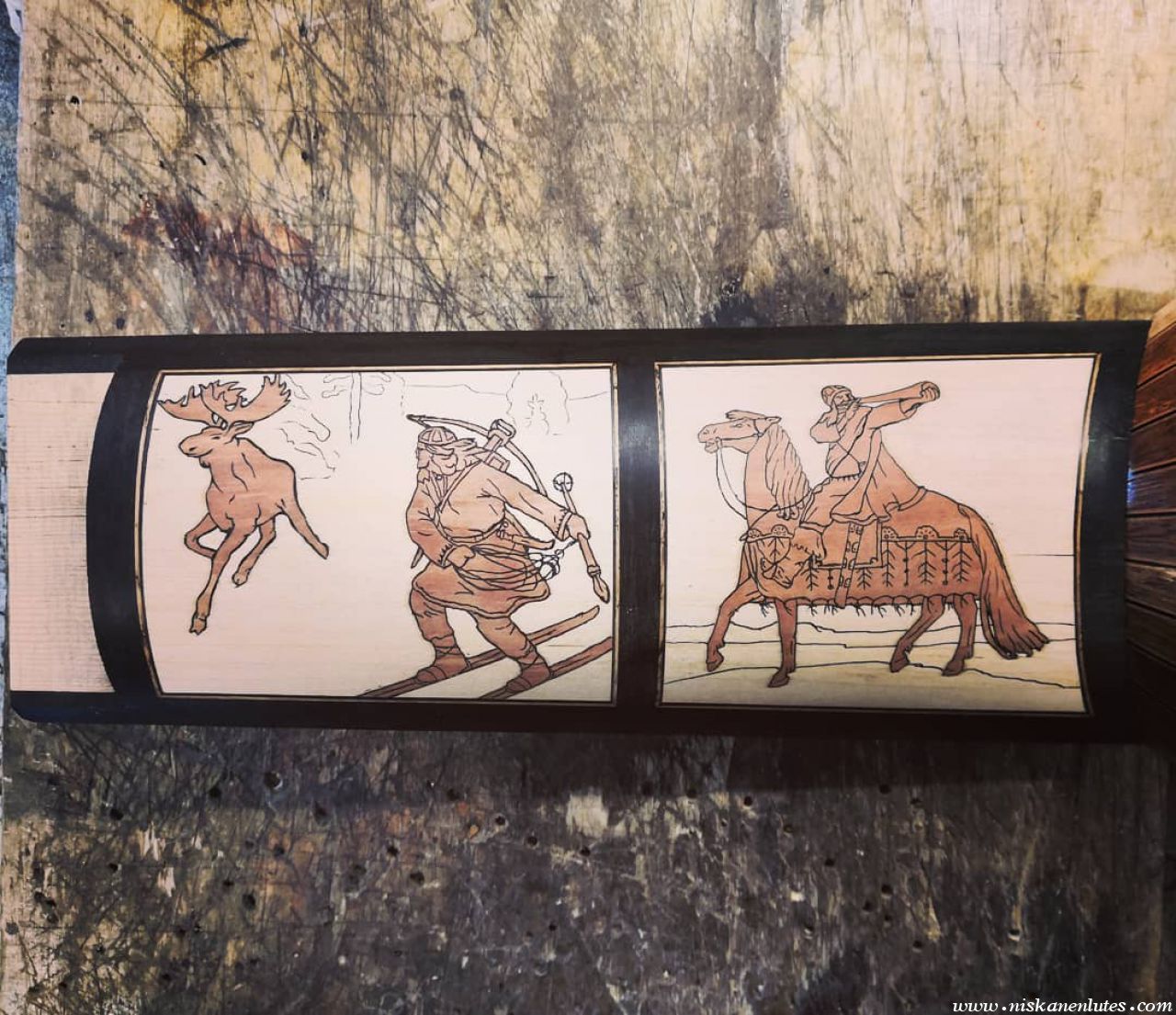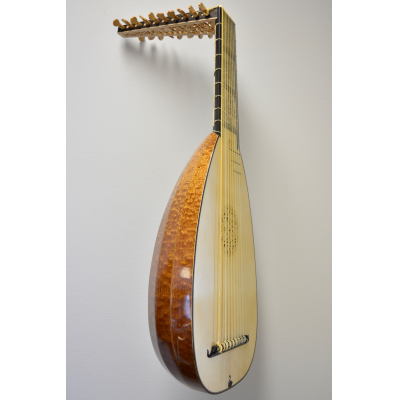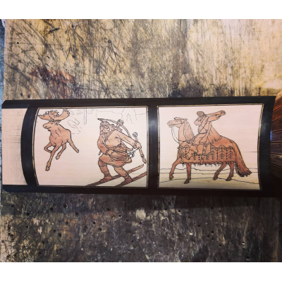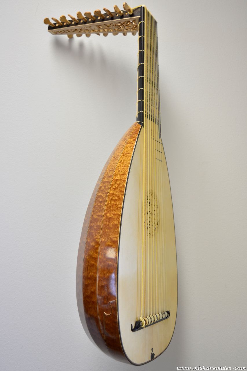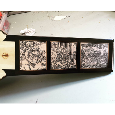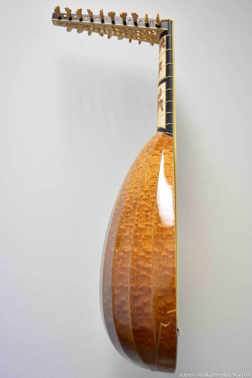 The neck panels are based on 20th century Finnish artists' depictions of the Kalevala epic. The rosette and pegbox designs are my own art. The body is made of figured sapele with cherry-ebony filets. 10 courses, based on the Hans Frei lute.