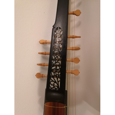 Padauk and visa birch theorbo based on the Harz body. Single strung English style extension with separate nuts for each bass string.