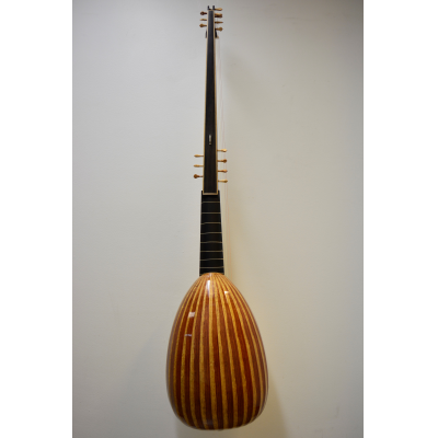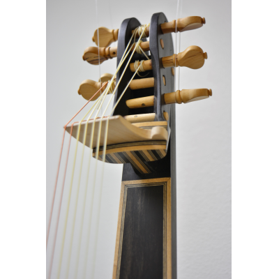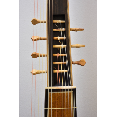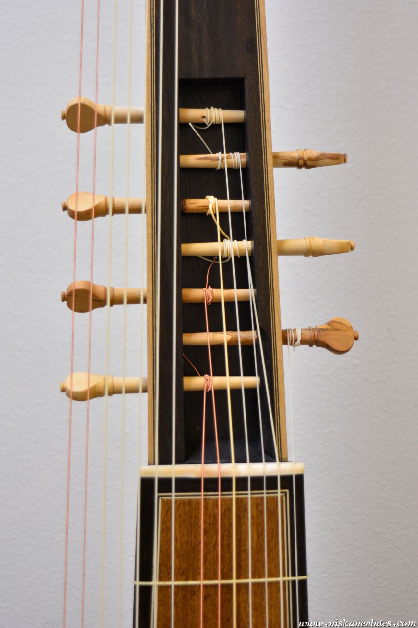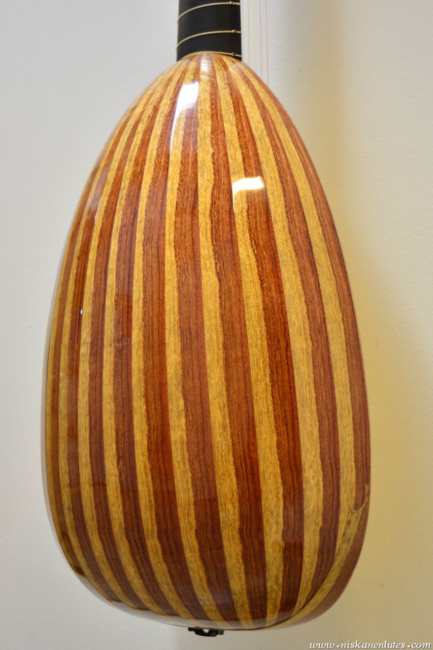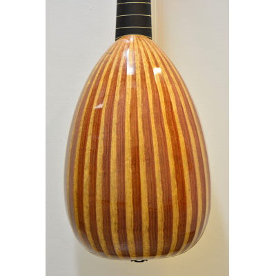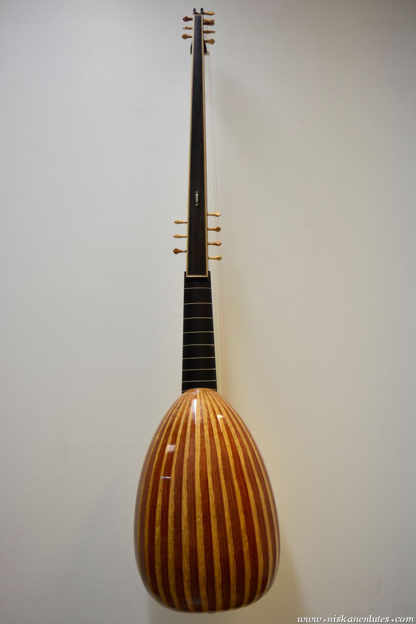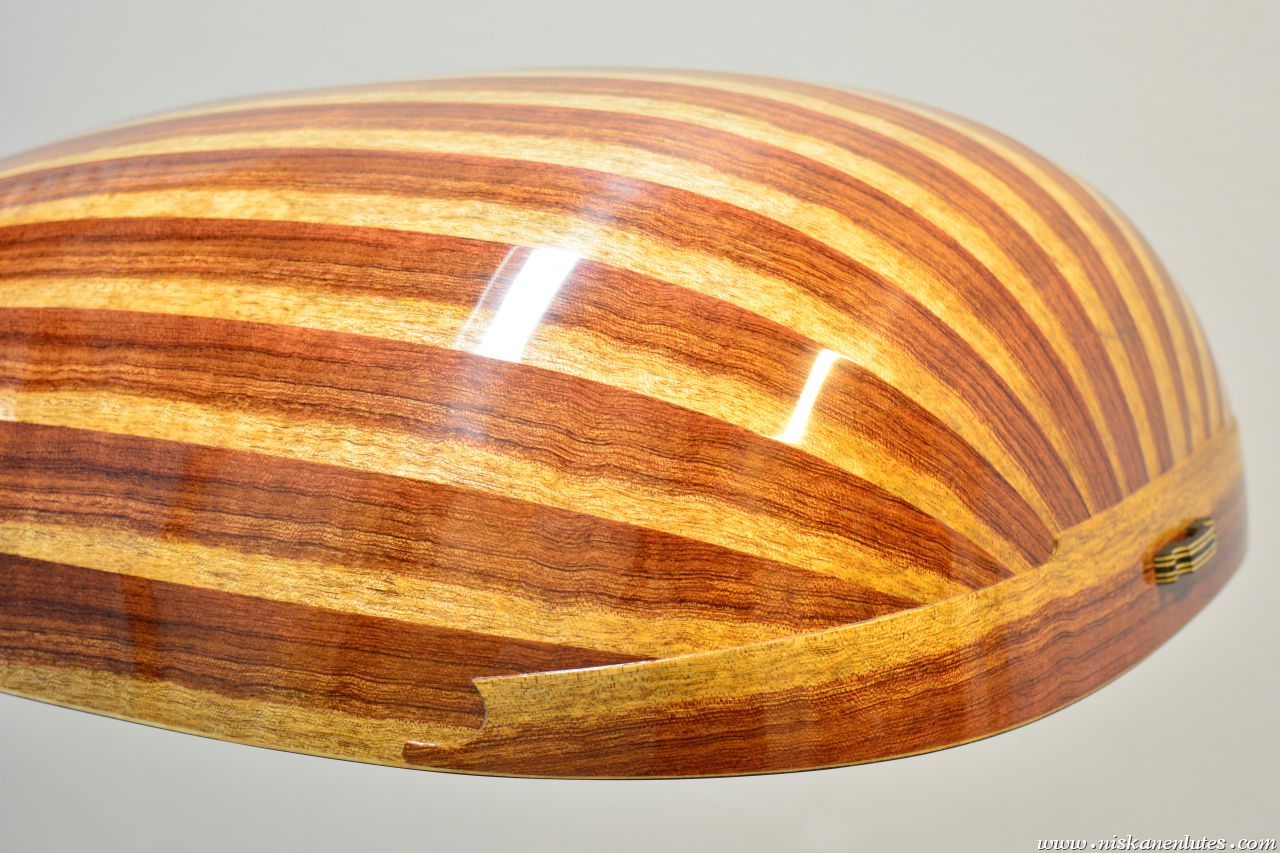 Body made of heart-sapwood bubinga. Ebony veneered neck and extension, aformosia fingerboard panel.