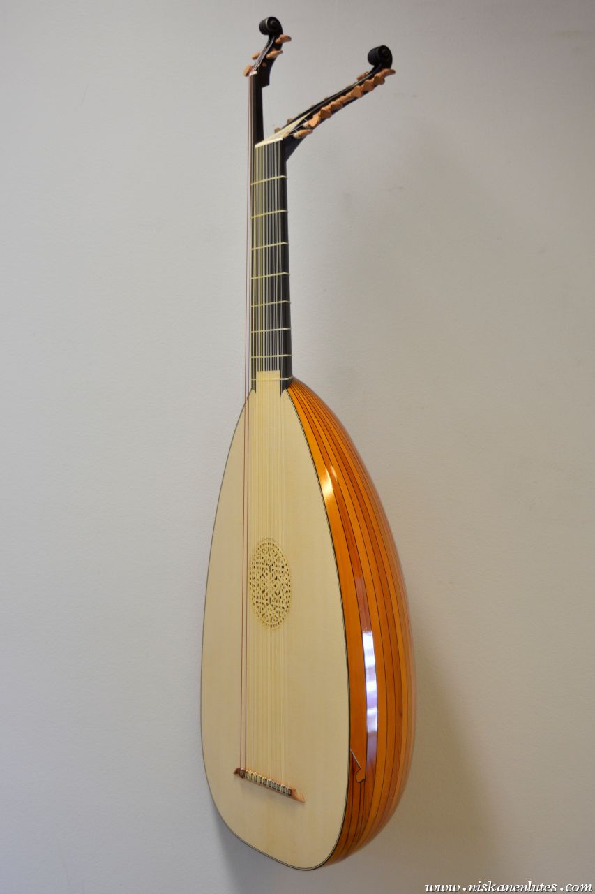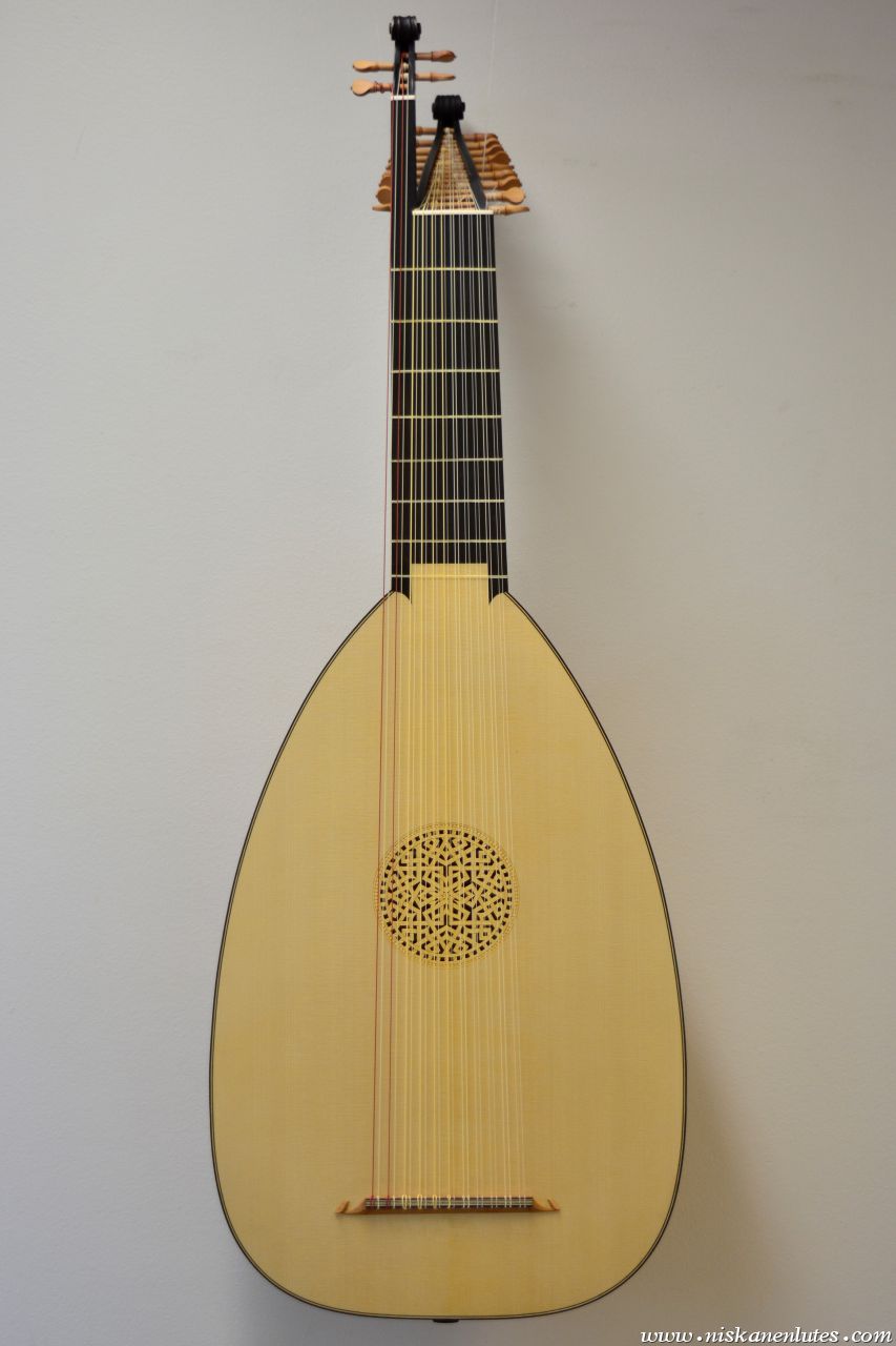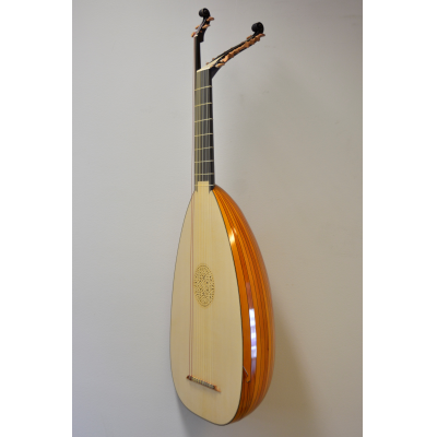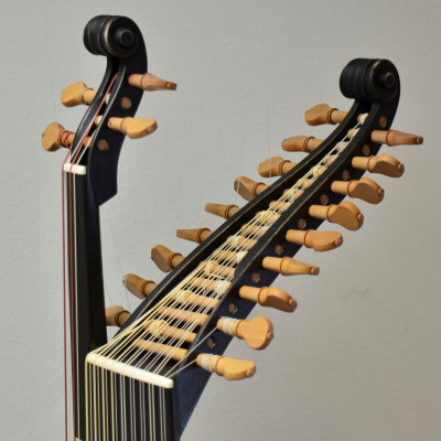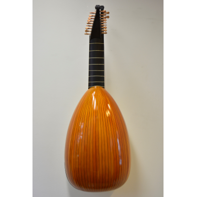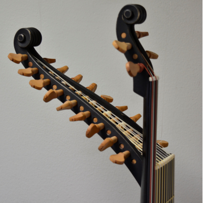 9+2 courses inspired by Carlo Sarazeni's painting "St.Cecilia and the angel". Based on the very large Hartung 1612 bass lute body. Yew body with colored varnish.