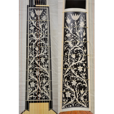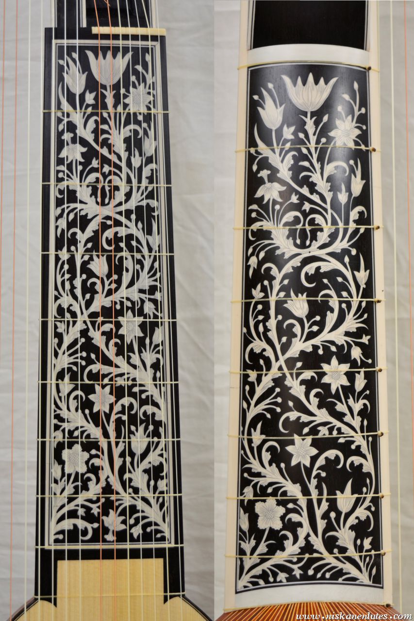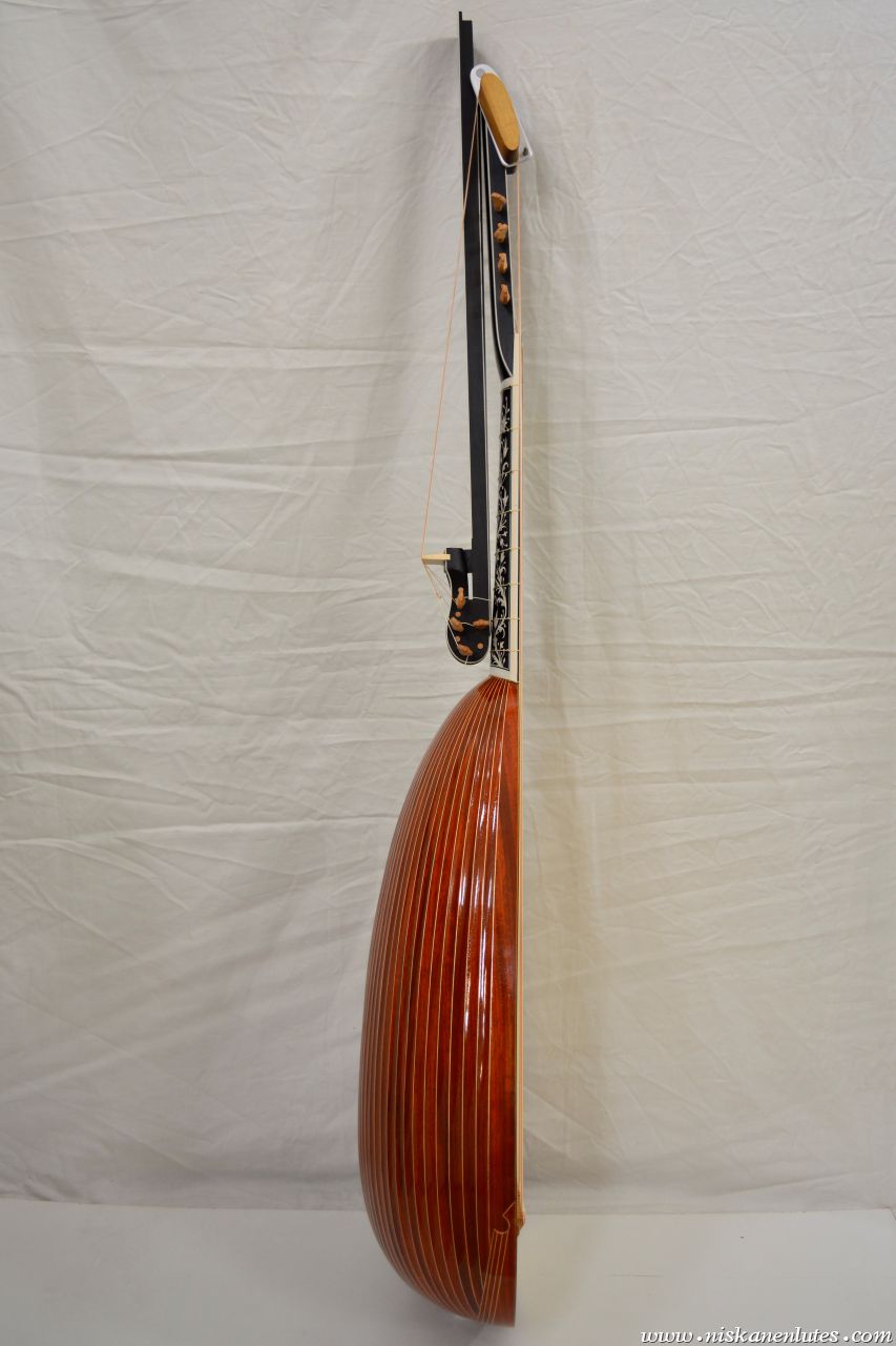 41 ribs of padauk with maple spacers. Ebony and elforyn scrimshaw inlays inspired by Ioachim Tielke 1696.