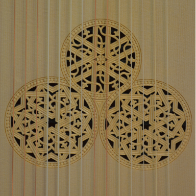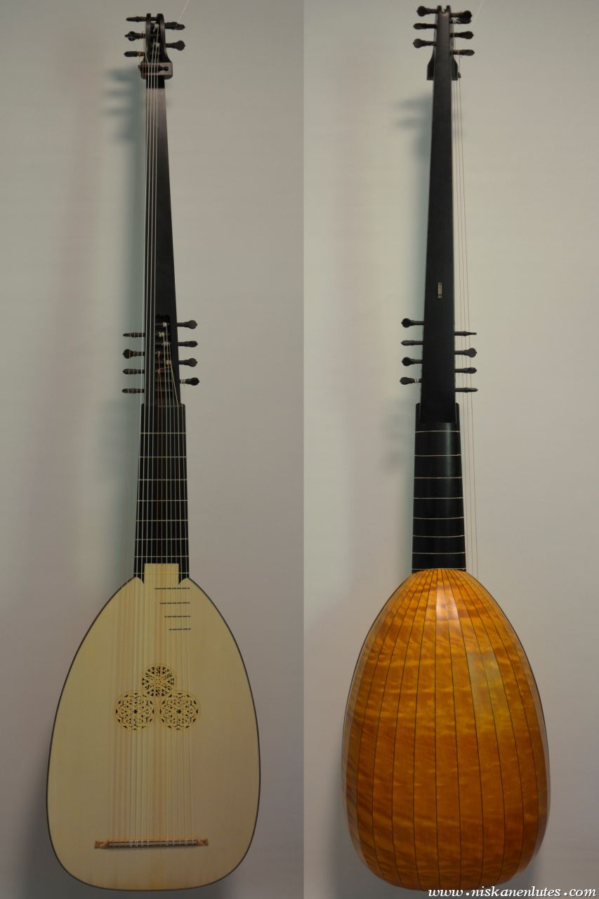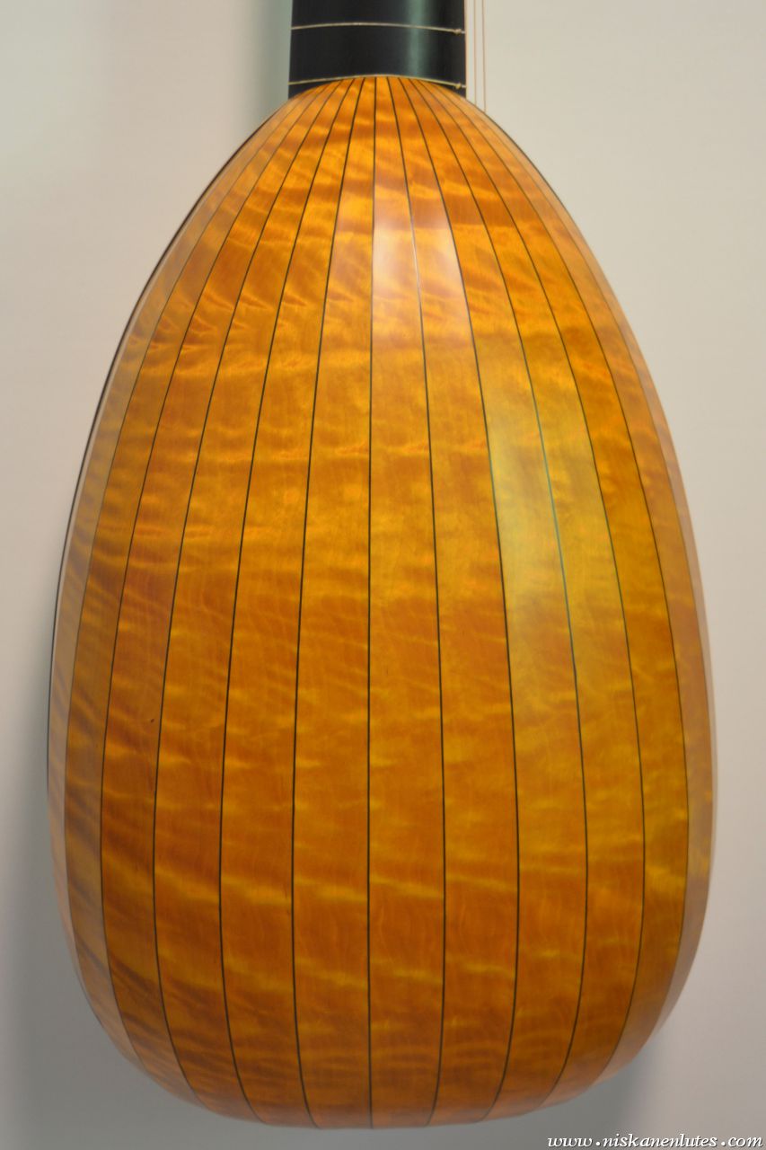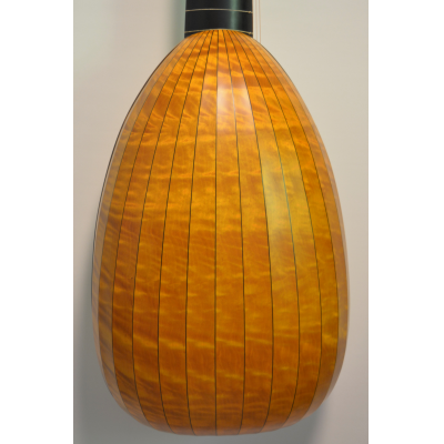 Body with 15 ribs of figured birch with colored varnish, ebony veneered neck, extension painted black.