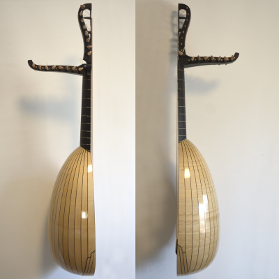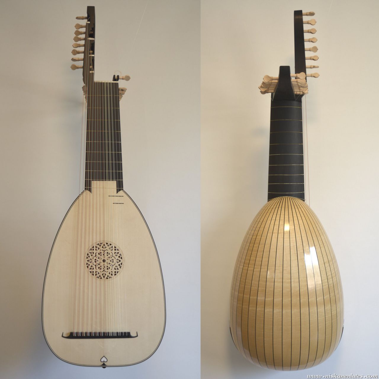 13 courses in the style of a Dutch 12c lute, based on the Burkholtzer body shape. figured maple bowl with subtly colored varnish.