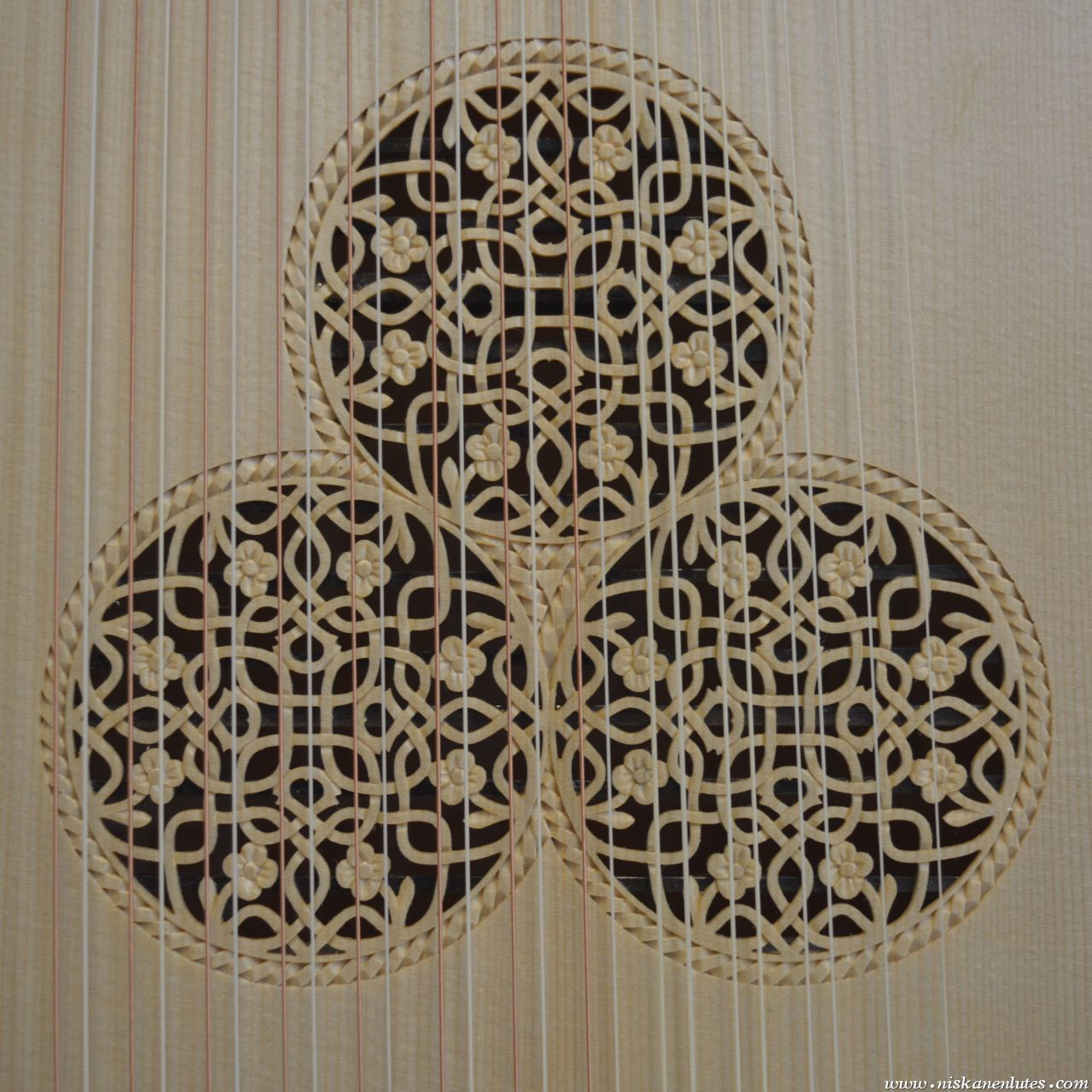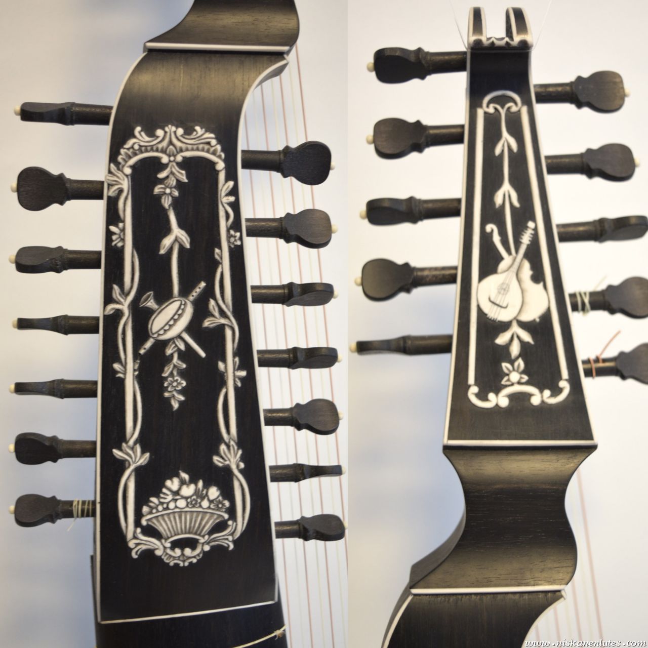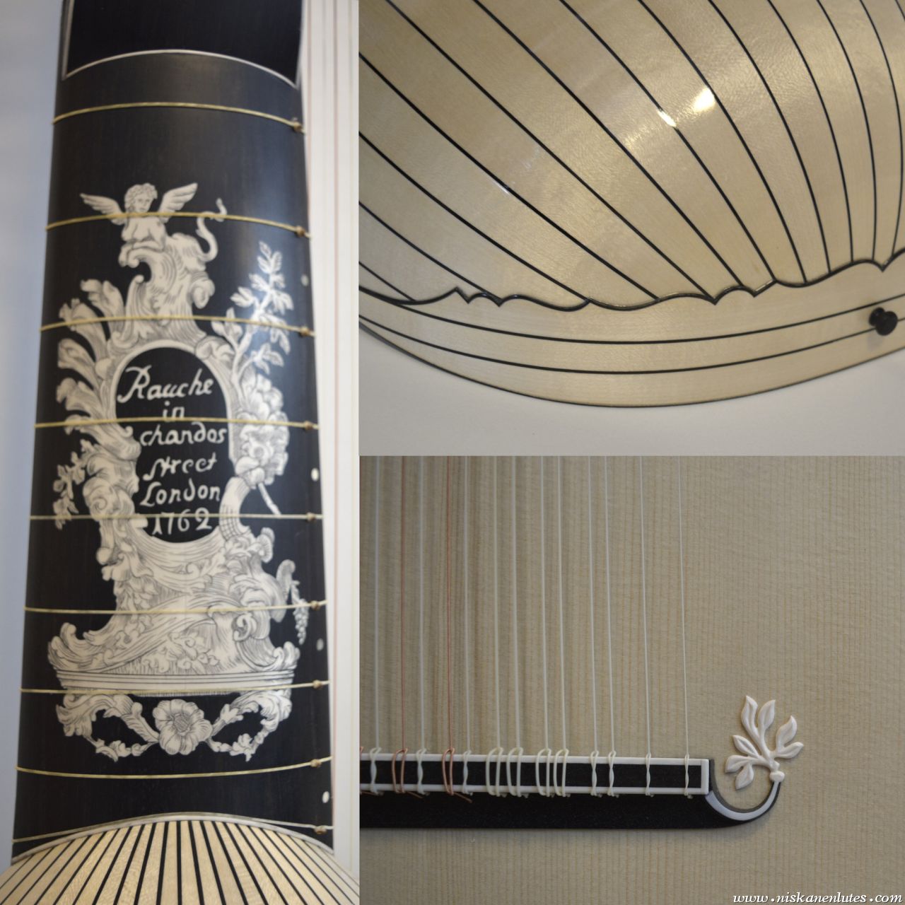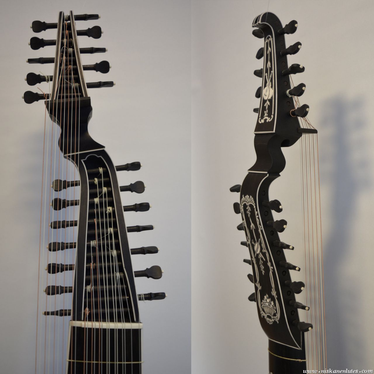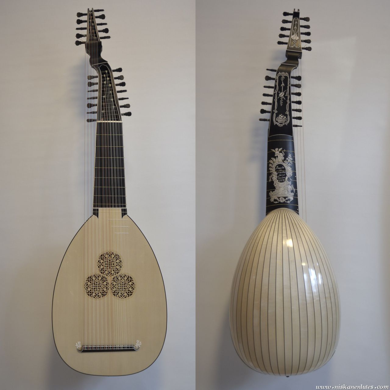 Copy of baroque lute by Michael Rauche 1762 in ebony and maple, with elforyn faux ivory inlays.