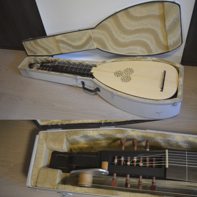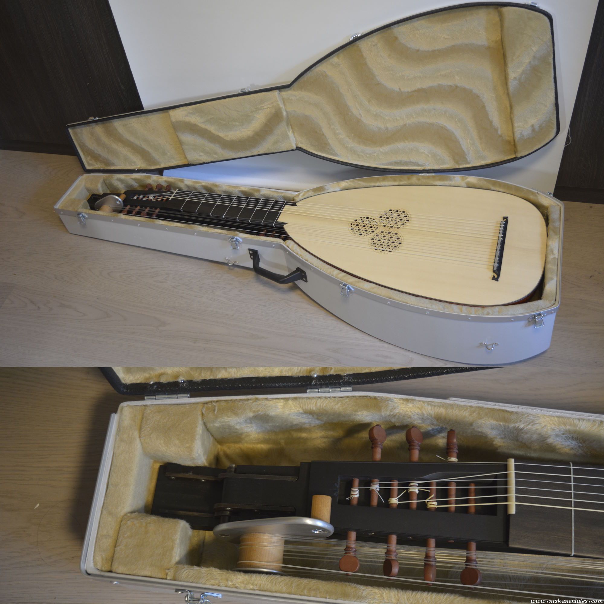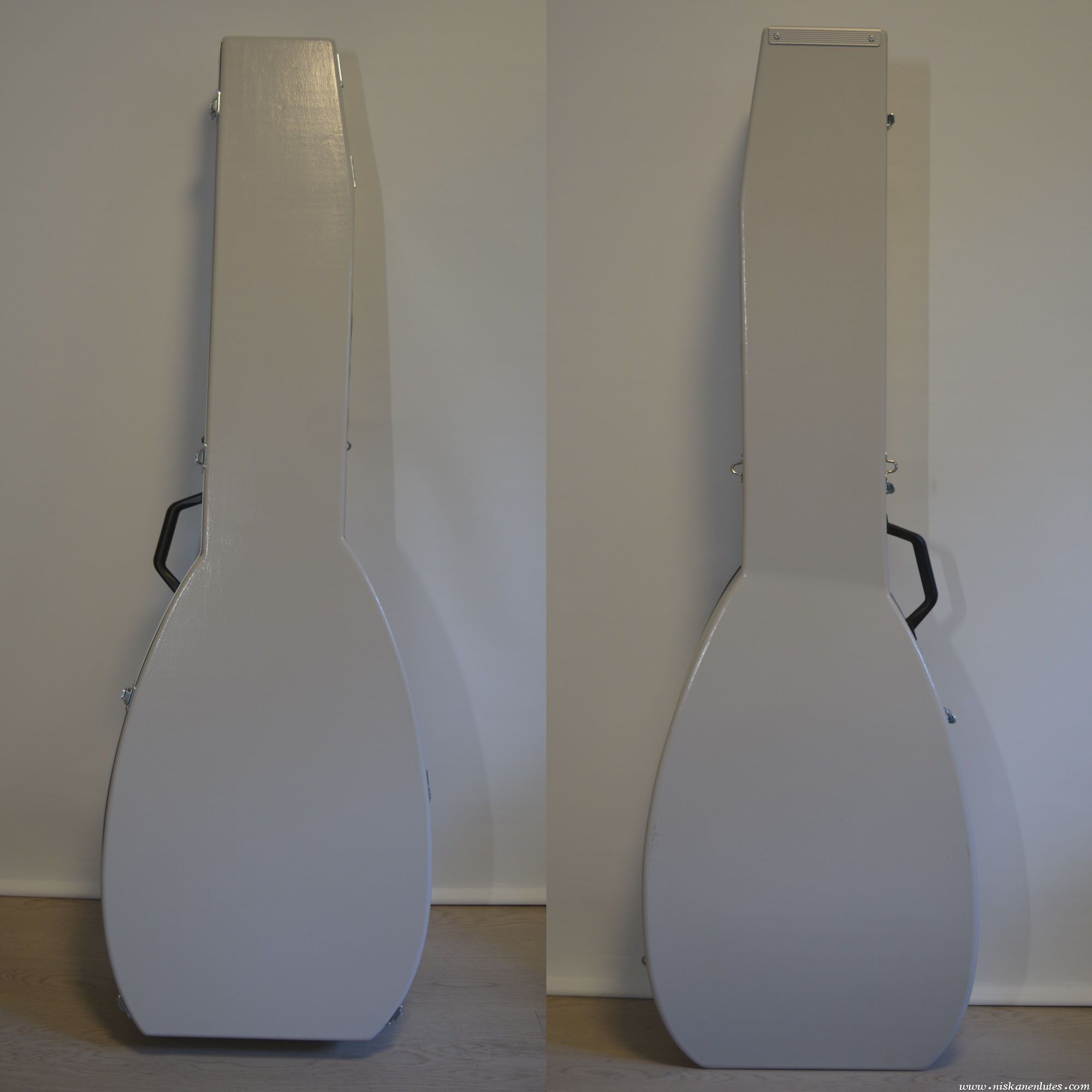 Baltic birch plywood, with fiberglass reinforcements on inside corners. Epoxy painted exterior, tightly fitted padded and upholstered interior. Aluminum lip on the outside of the case keeps sides from bending in due to bumps to the sides.