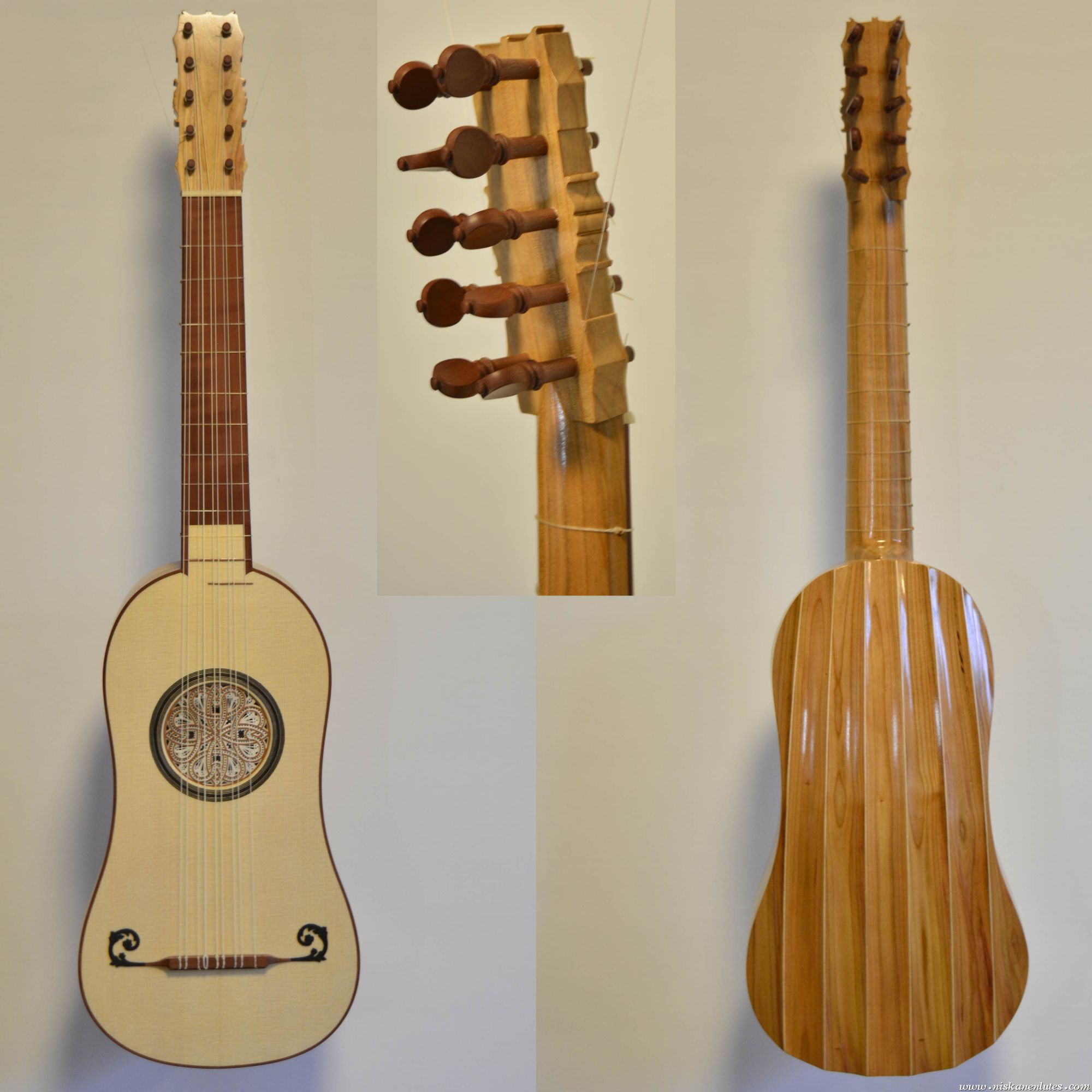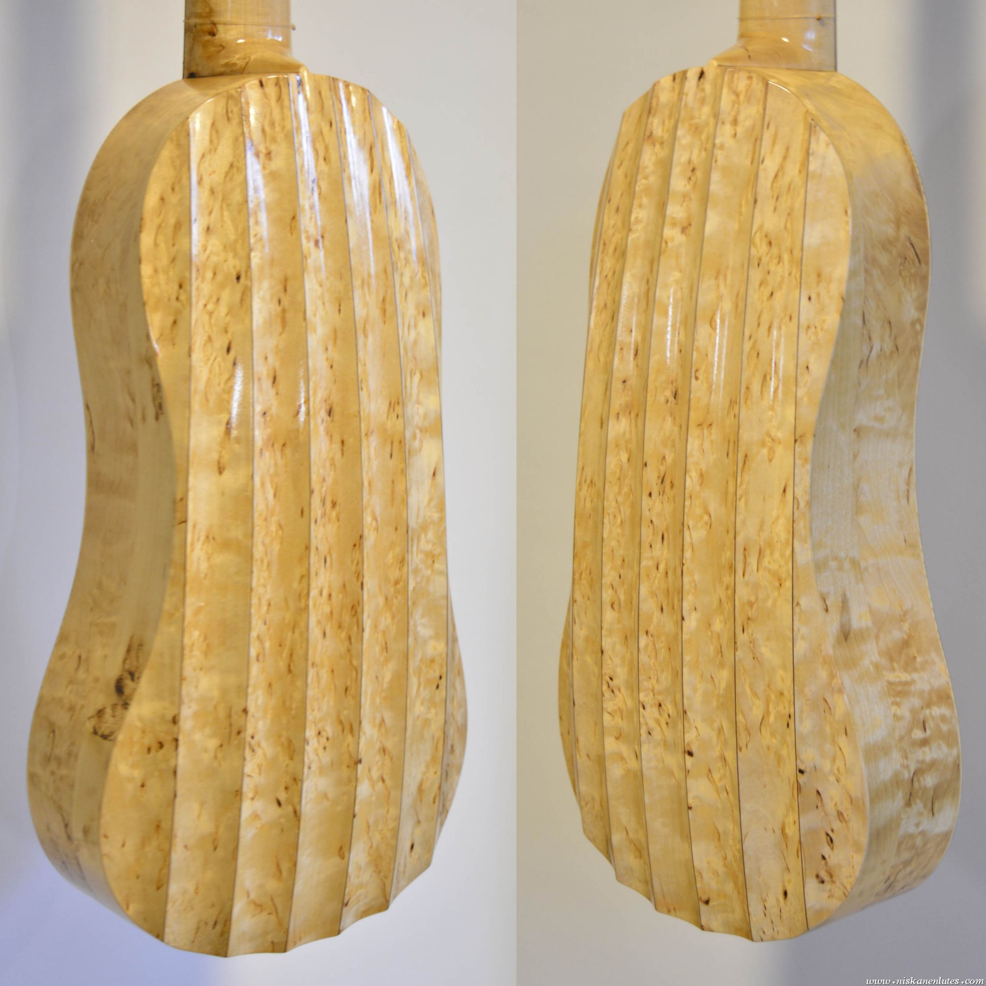 Two identical instruments except using different woods for the body, and only European woods. The first one is made of visa birch, the second one is plum. Both have a pear fingerboard.